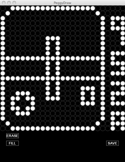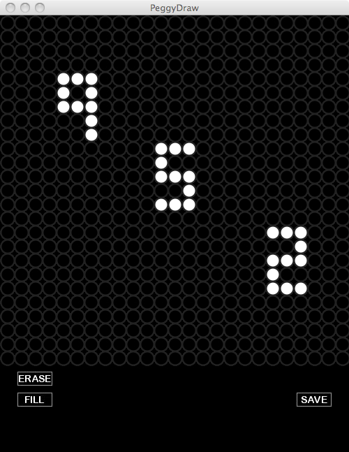 Peggy board displays only three digits hanging in various vertical distances along the board. When any digit increases, that specific digit falls to the bottom in a "matrix" (i.e. random character/structure/display) fashion until it hits the bottom and wraps back to the top until it forms the correct number. Each digit is placed at a random vertical distance every time it falls.